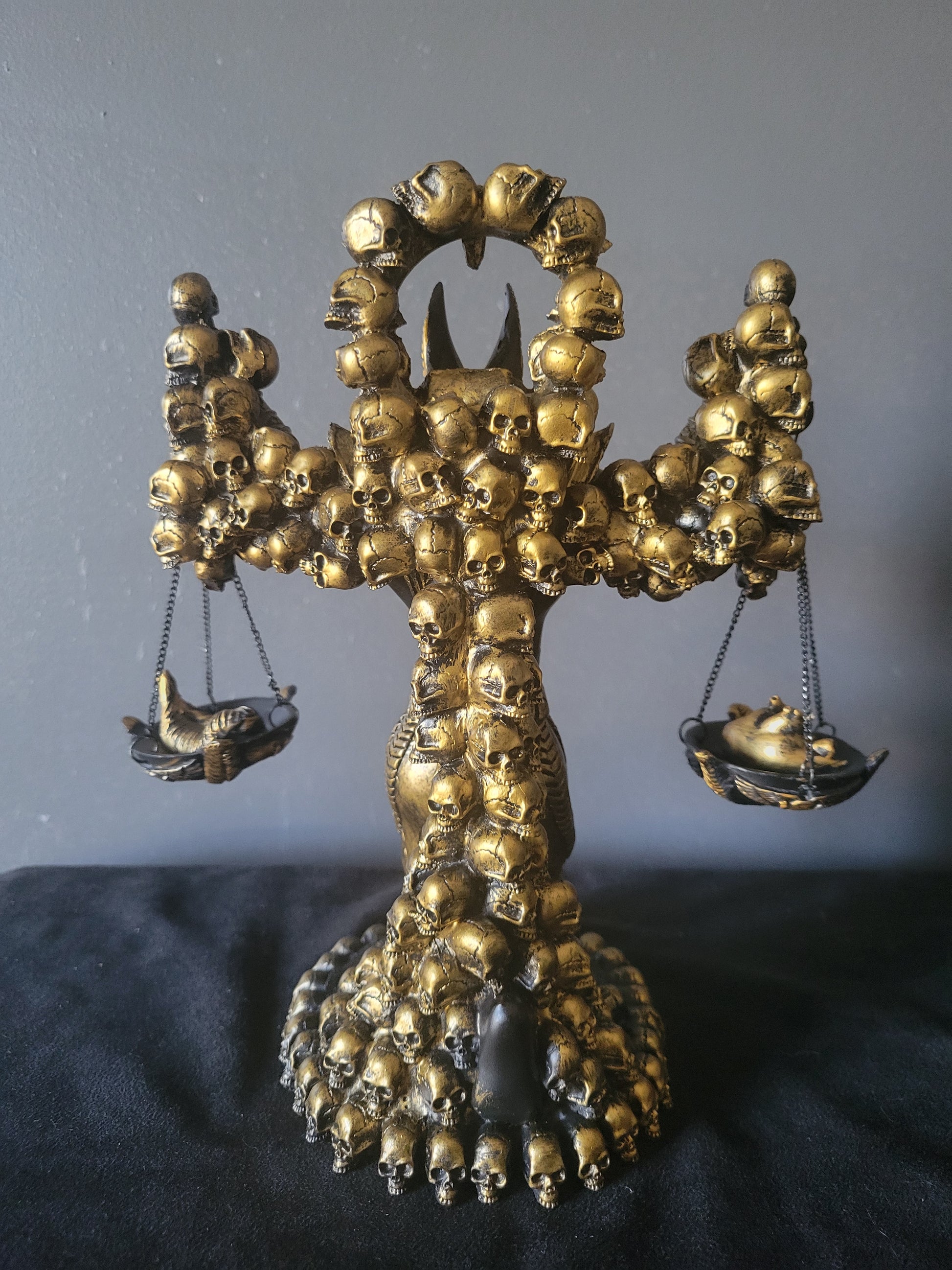 Pay tribute to the guardian of the dead, the god of embalming and funerary rites, Anubis, with this stunning and ornate statue of the jackal-headed god. As the soul makes it's way into the afterlife, Anubis weighs the individual's heart against a feather, thereby determining if that soul should pass safely into the afterlife. This statuette of Anubis comes with detachable scales which can be gently hooked underneath each of his hands, resulting in a truly magnificent display.