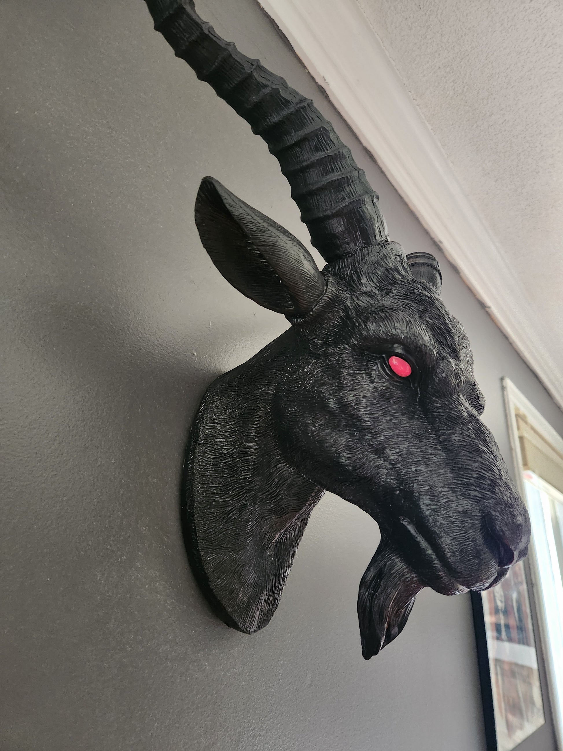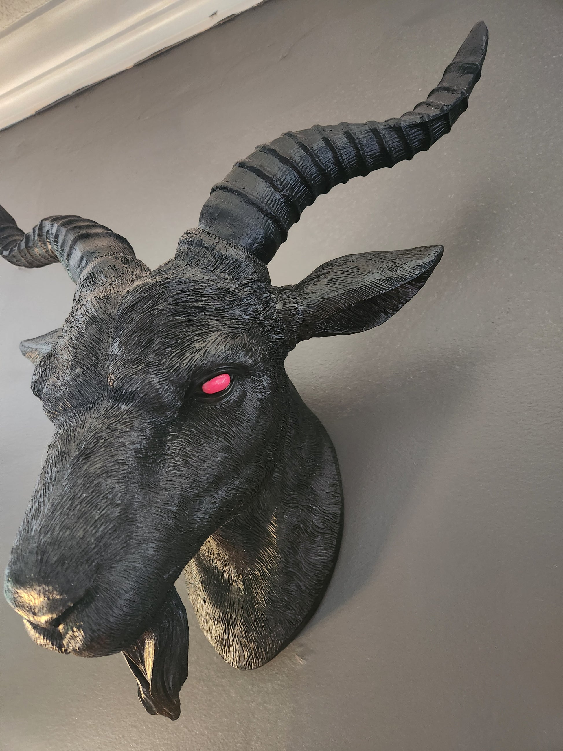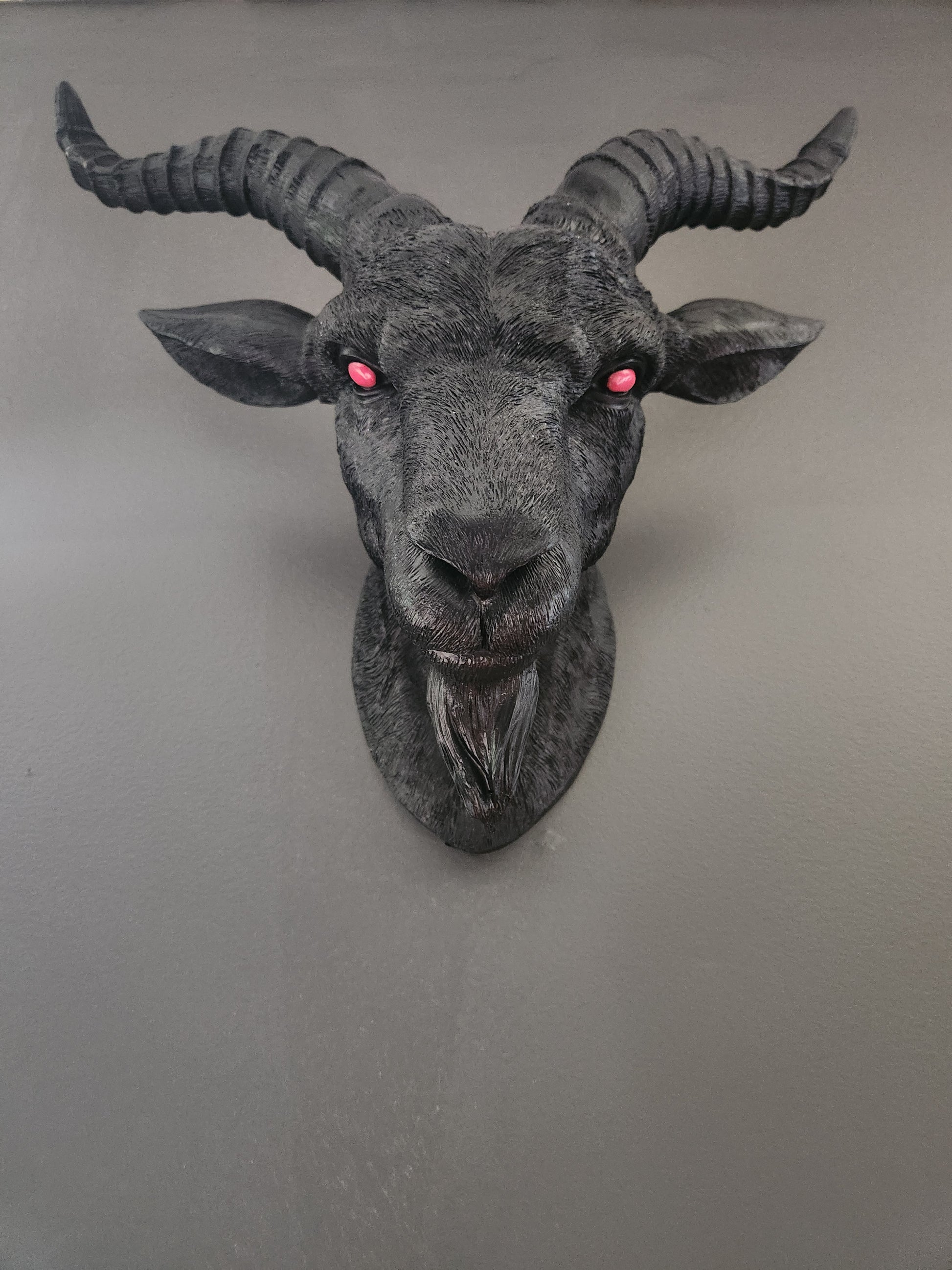 Summon a bit of supernatural style in your home with this Baphomet goat head wall sculpture. Solidly cast in resin with a hand-painted black finish, it captures the demonic aura of the Dark Lord, adding a devilish flair to your decor. Whether accenting an occult-themed room or just bringing The Beast into your living room, bedroom, or bathroom, it's sure to make its presence known with its eye-catching design and sizable shape.