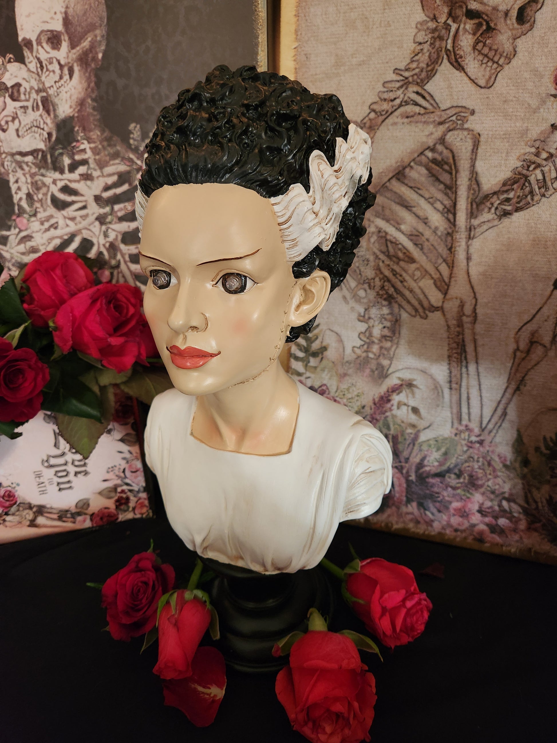 She's alive.. ALIVE! Sculpted from cold cast resin, this stunning bust of the Bride of Frankenstein makes a wonderful addition for horror fans and collectors, as well as a great piece for the Halloween and Valentine's seasons. Comes with an LED feature in which the eyes glow.