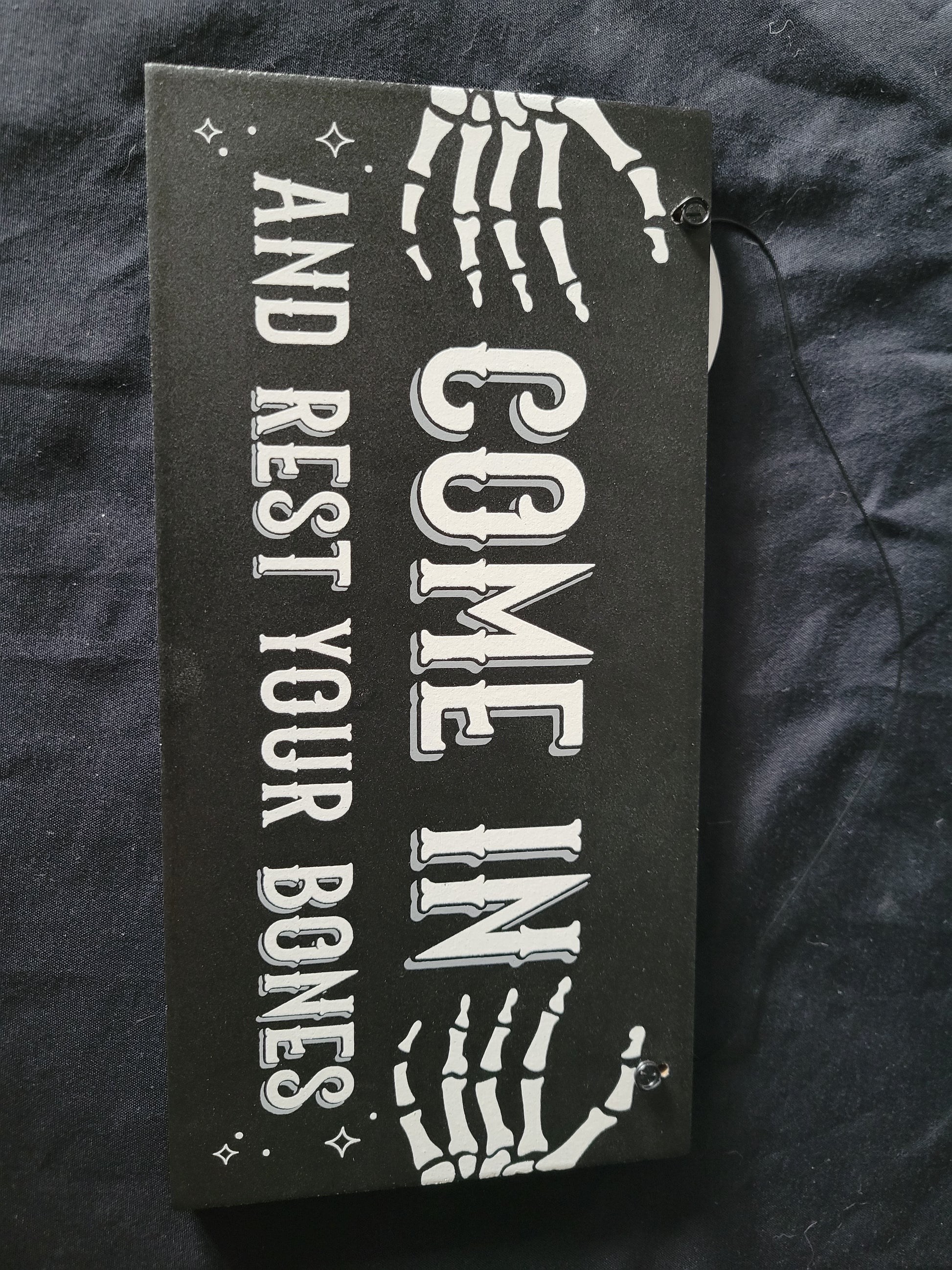 Let weary visitors know your home is open for them to come in and rest their bones with this hanging black sign with a contrasting white bones design. Perfect for Halloween or as a year-round decorative accessory for any haunted home.