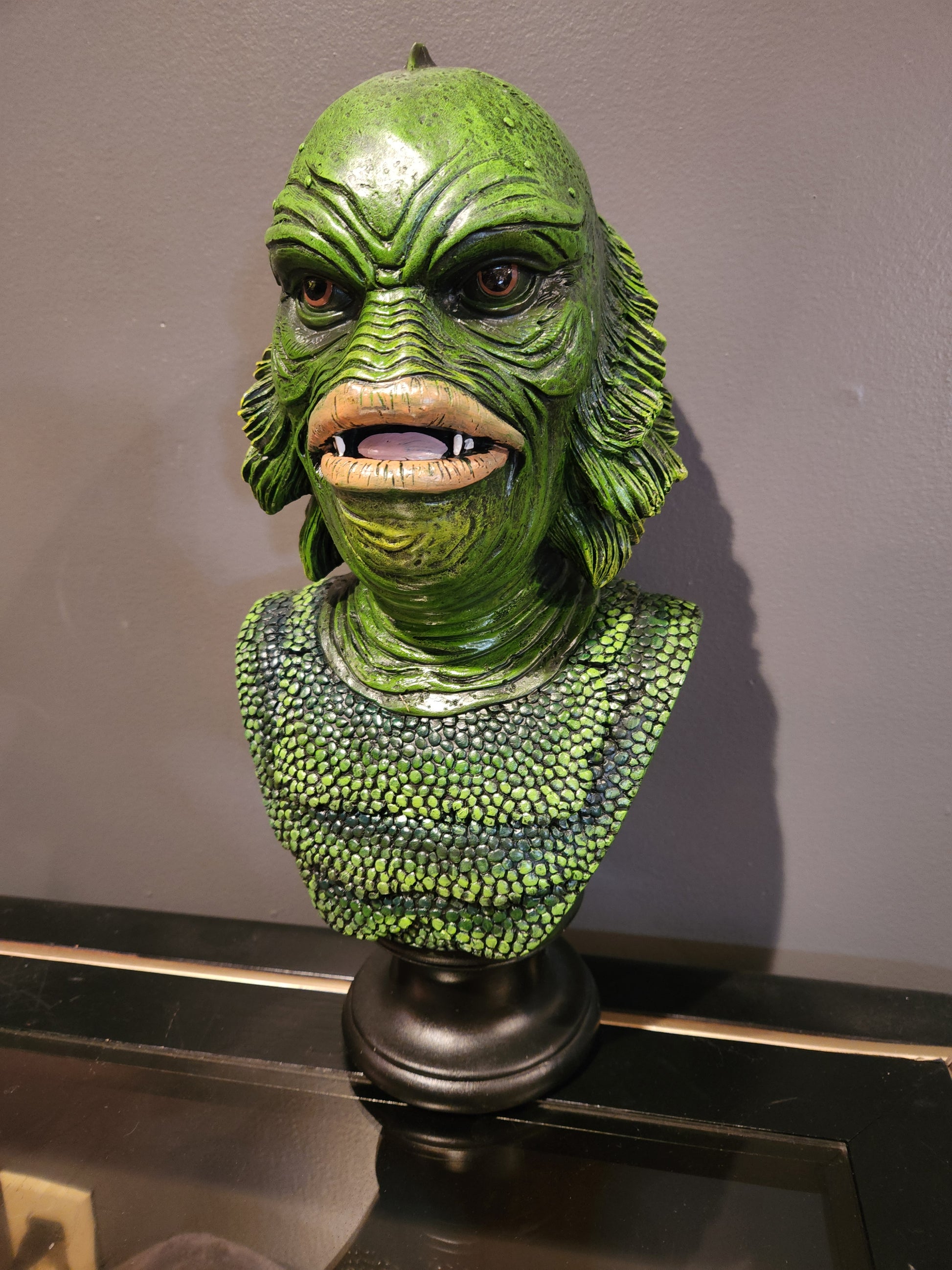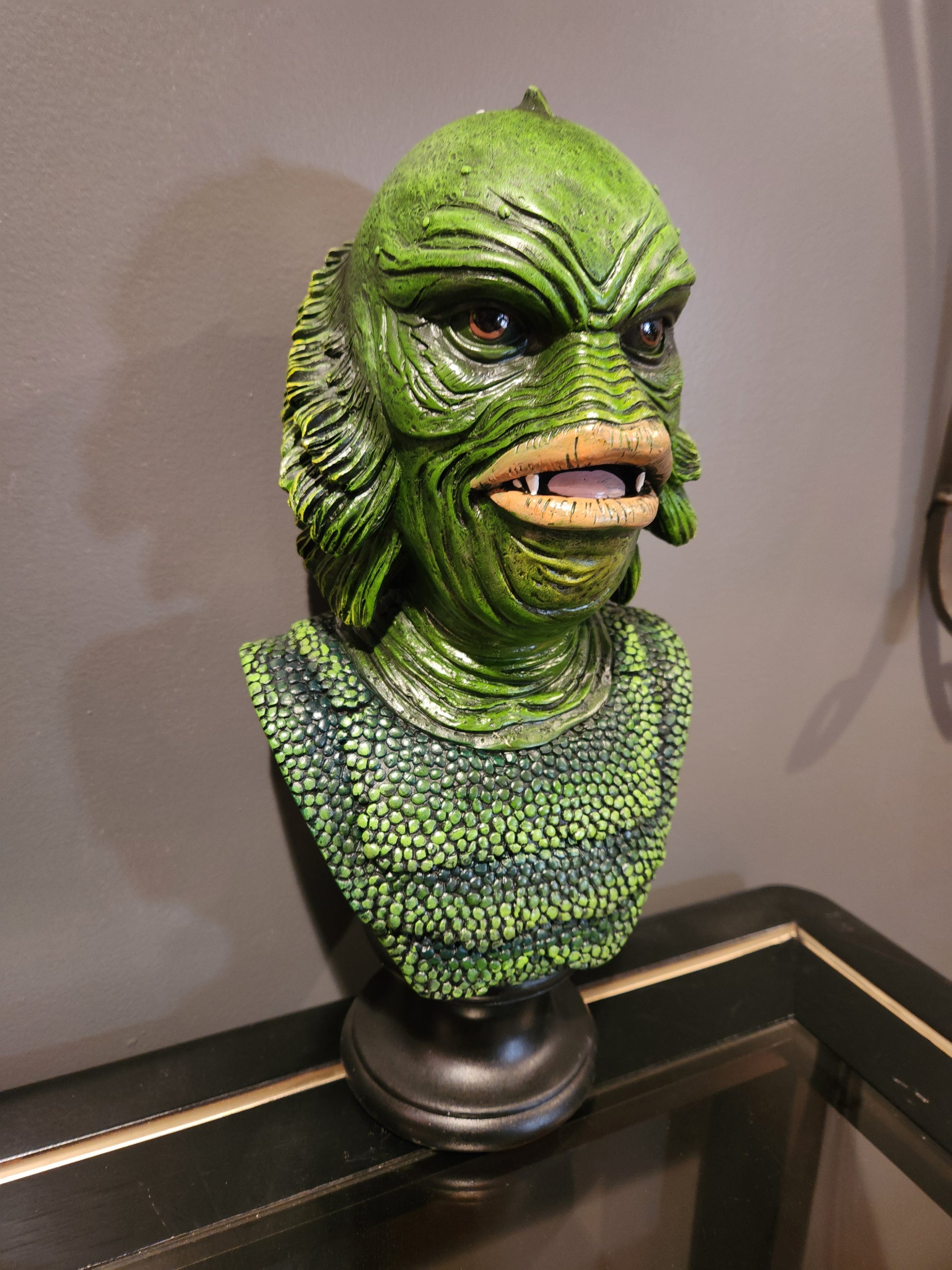 There's something in the water. Thrill and terrify your guests with this incredible bust of the gill-man, the iconic aquatic monster from 1954's Creature from the Black Lagoon. Sculpted from cold cast resin, this stunning bust makes a wonderful addition for horror fans and collectors, as well as a great piece for the Halloween season.