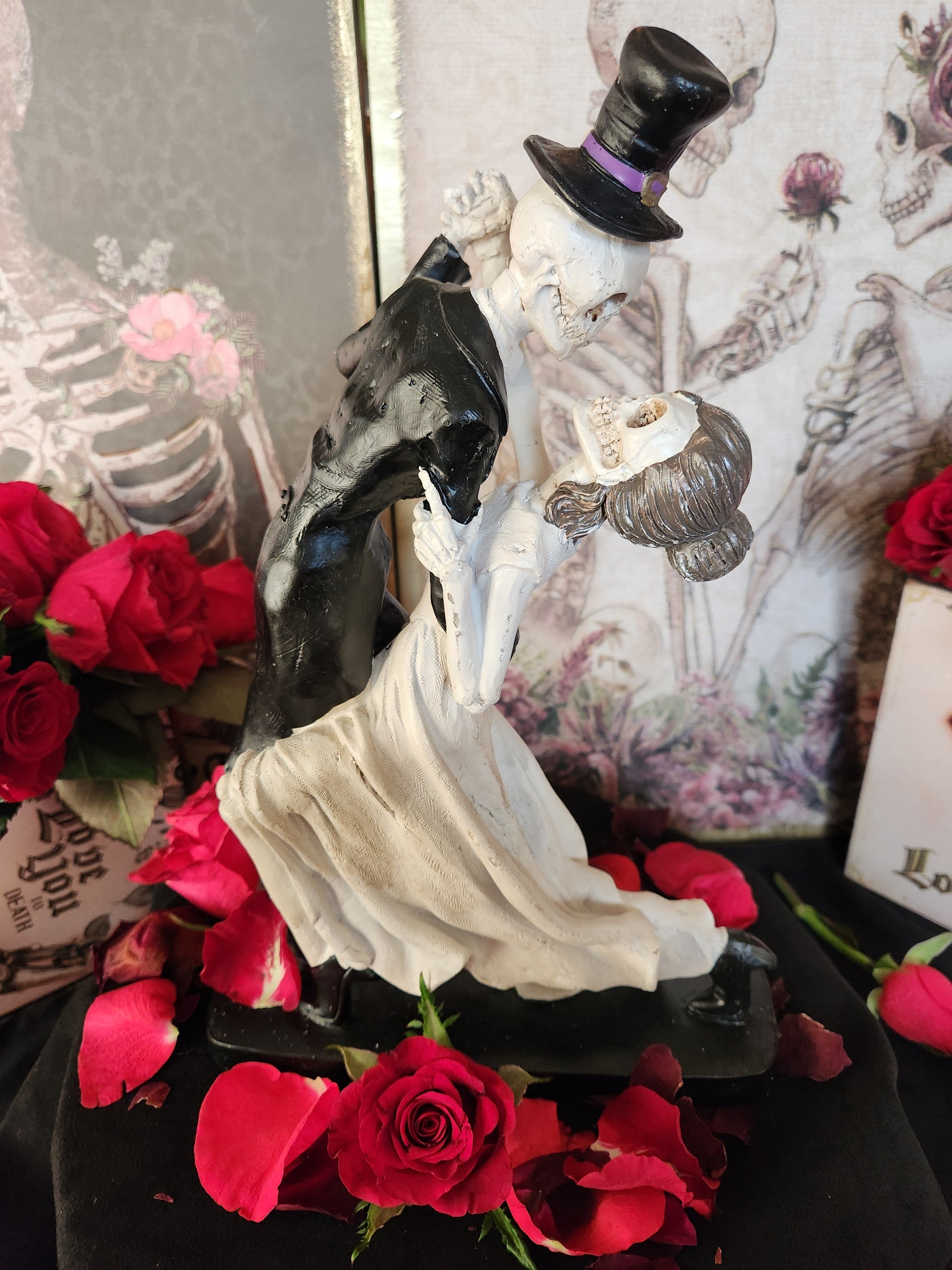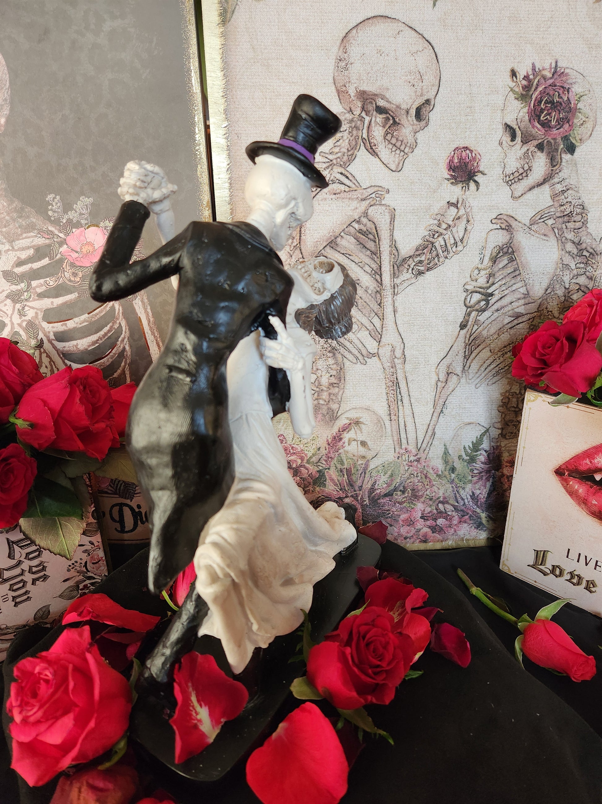 This unique piece is not just a decorative tabletop object, but a statement of enduring love. Made with cold cast resin, it showcases a dancing couple that embodies the timeless statement that love never dies. Add a touch of gothic romance to your space with this beautifully crafted object.