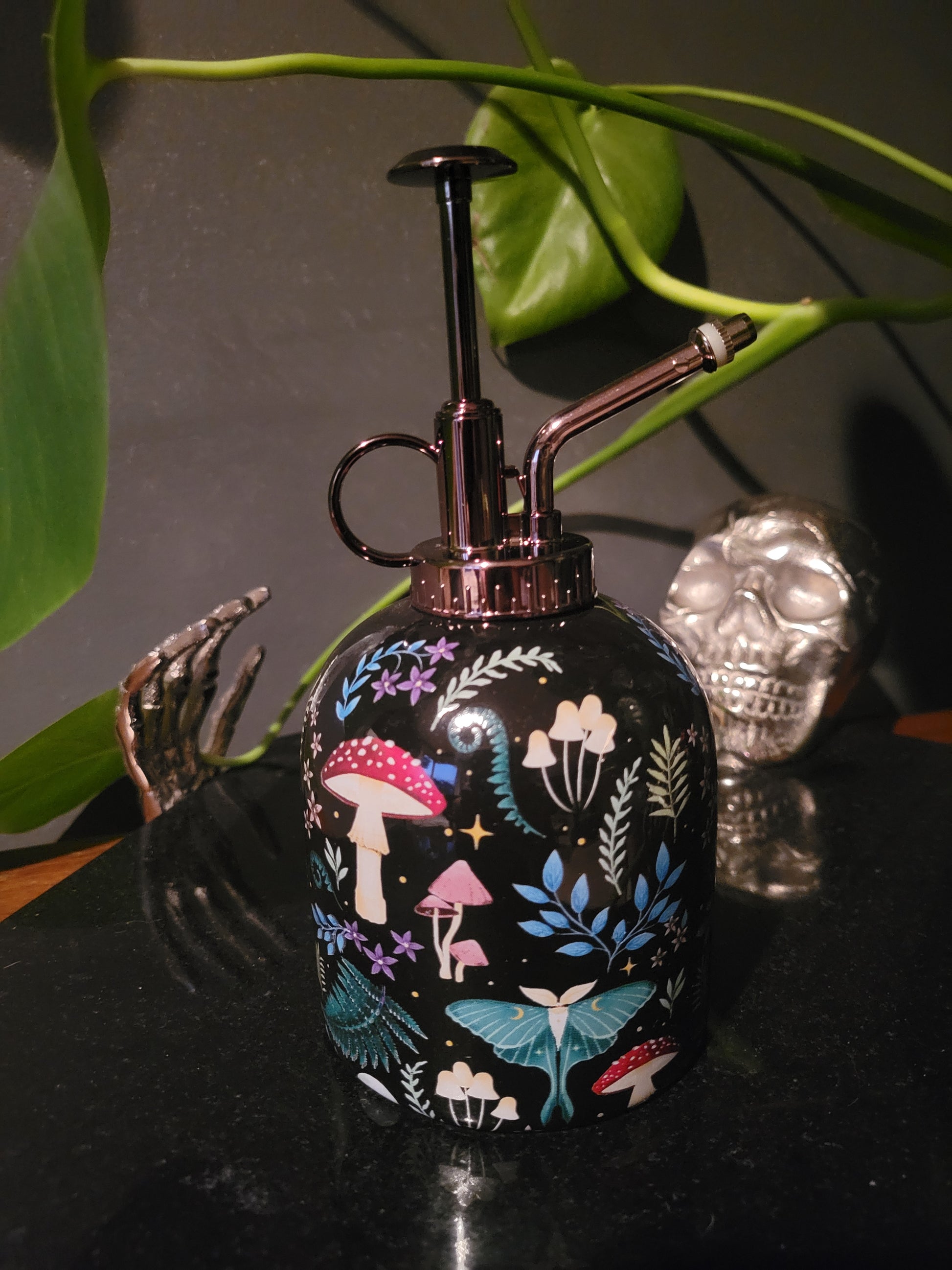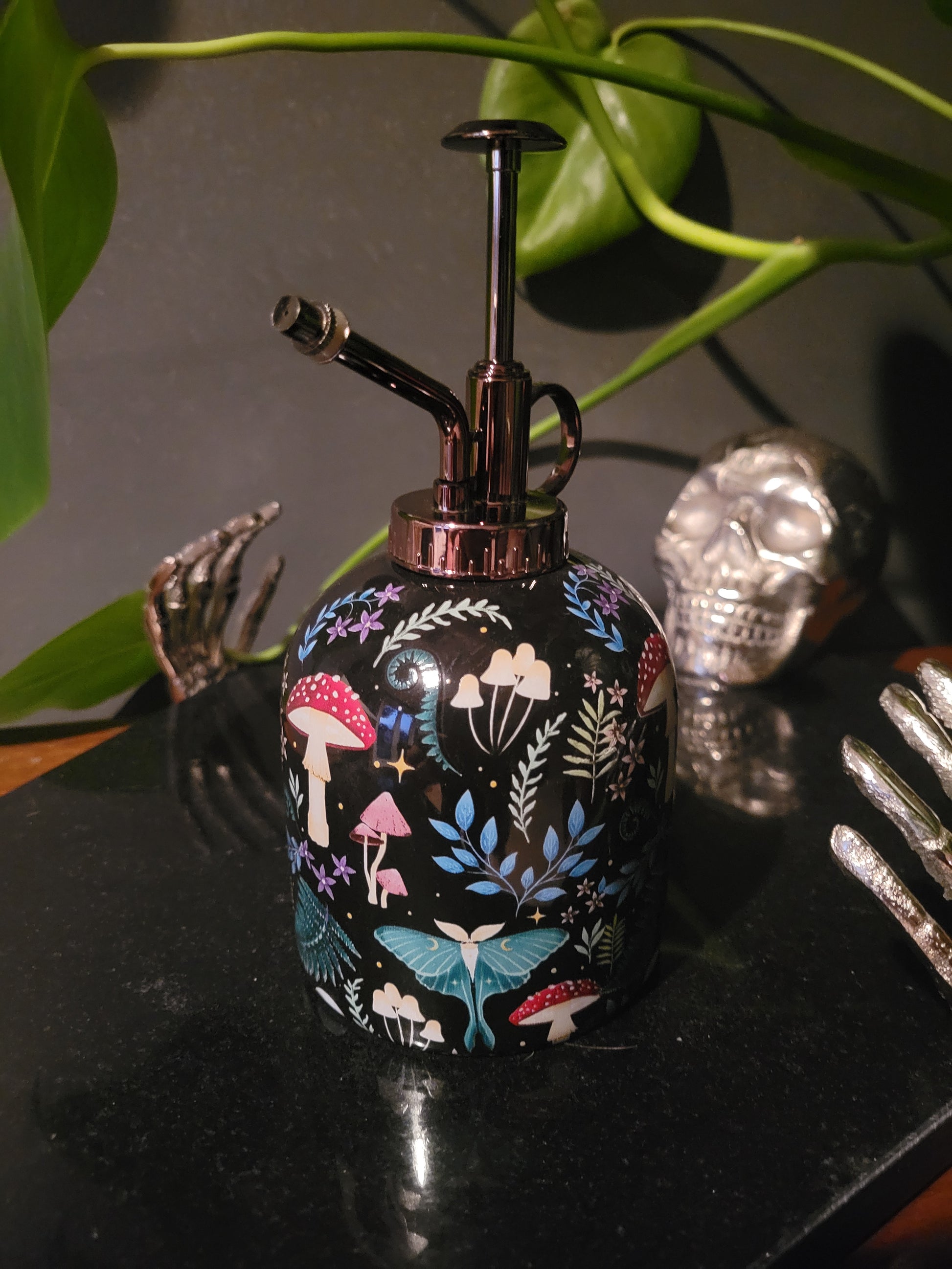 This stunning glass plant mister features a beautiful dark forest design complete with illustrations of flora and fauna across a black background sprinked with pretty moon and star details. This mister makes a great gift idea for any indoor garden enthusiast and is an eye-catching home accessory even when not in use.