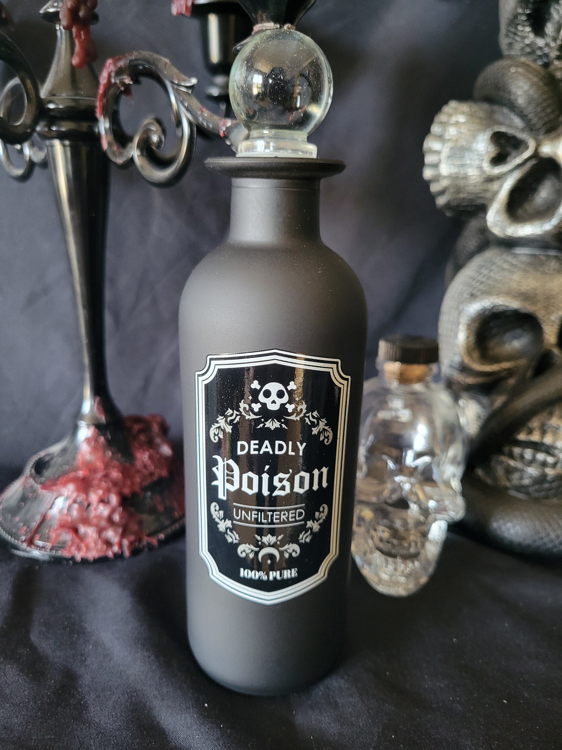 Create your own wicked apothecary with this decorative potion bottle. Made of frosted glass accented by a vintage-inspired 'Deadly Poison' label and finished with a clear glass stopper for capturing all things dark and mysterious.