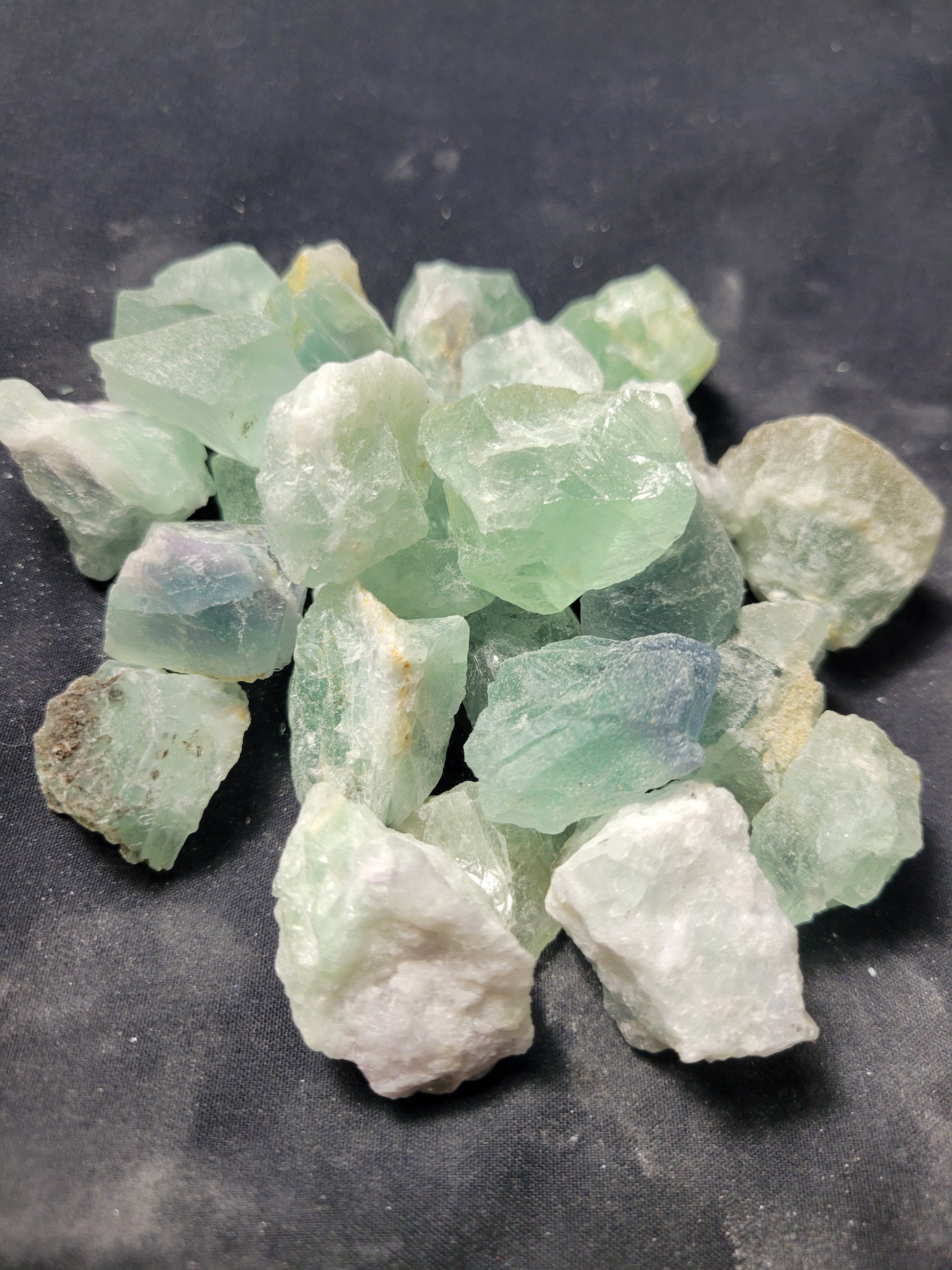 Rough natural purple and green fluorite crystal. Some bags may only contain one color or a big mix of purple and green.