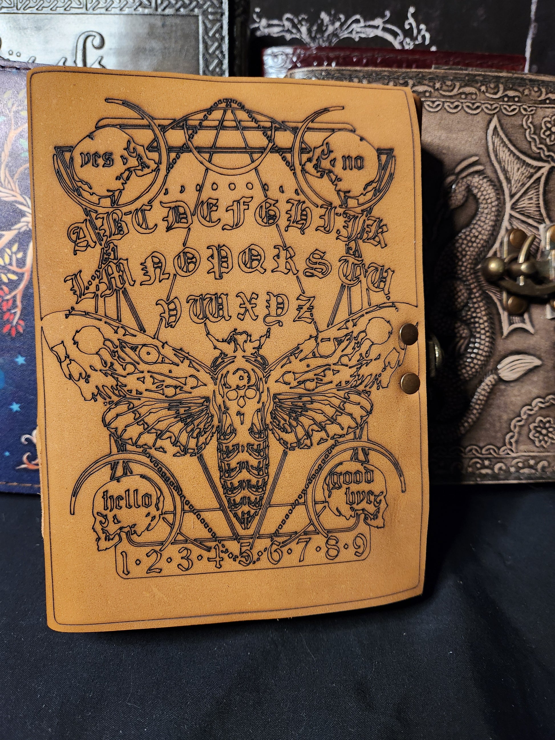 This journal is made of soft leather and has aged linen pages, giving it a truly ancient and mystical quality. The cover is adorned with the outline of a spirit board and death-head moth, along with other occult symbols and sigils.
