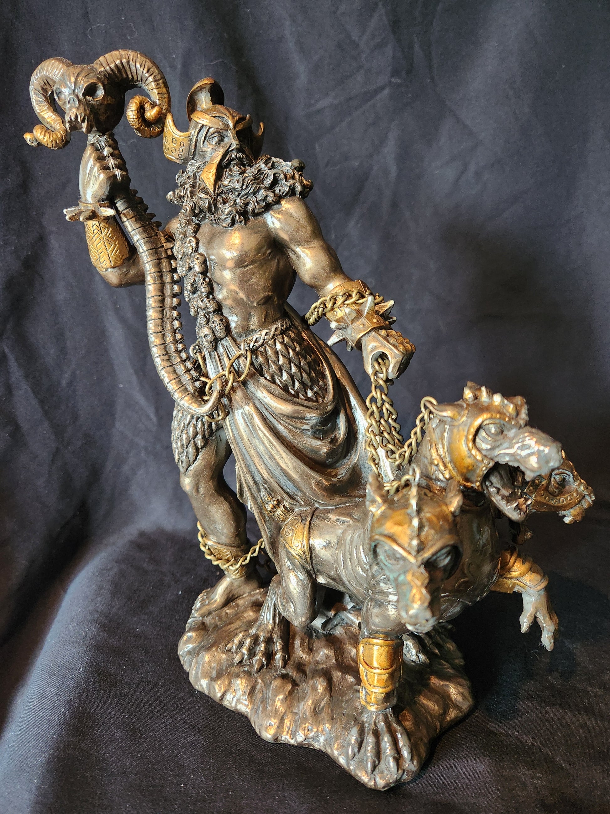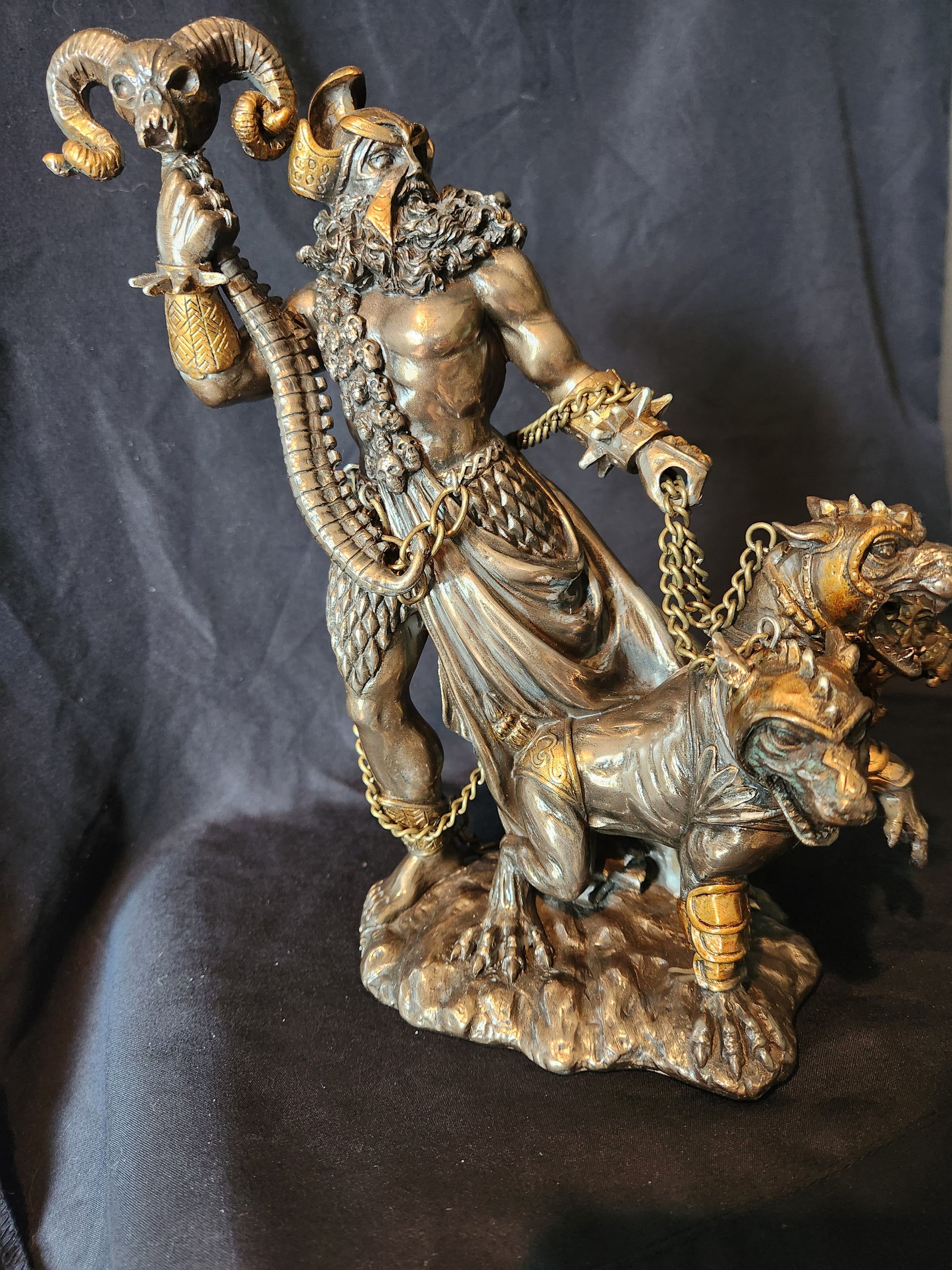 The lord of the dead is depicted here in all his glory accompanied by Cerberus, the 3-headed demonic guard dog to the underworld.