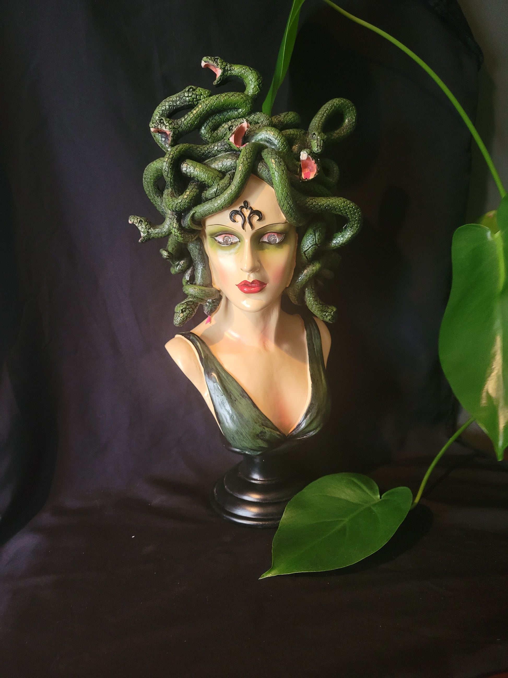 Petrify your guests with this beautiful, cold cast resin bust of the gorgon, Medusa. A complex mythological figure, Medusa symbolizes a myriad of qualities and characteristics including protection, inner strength, empowerment, femininity, beauty, desire, death, and fear.