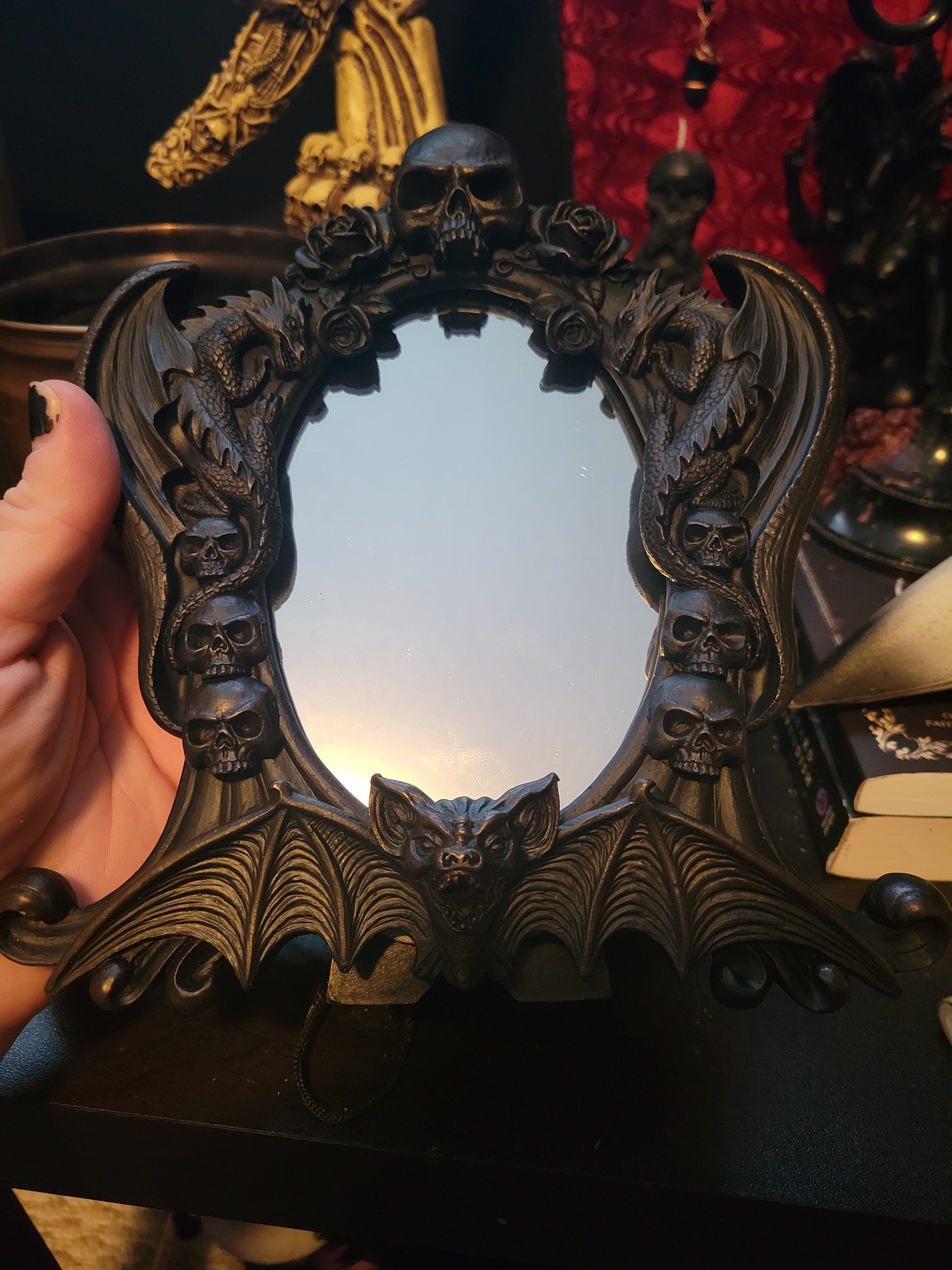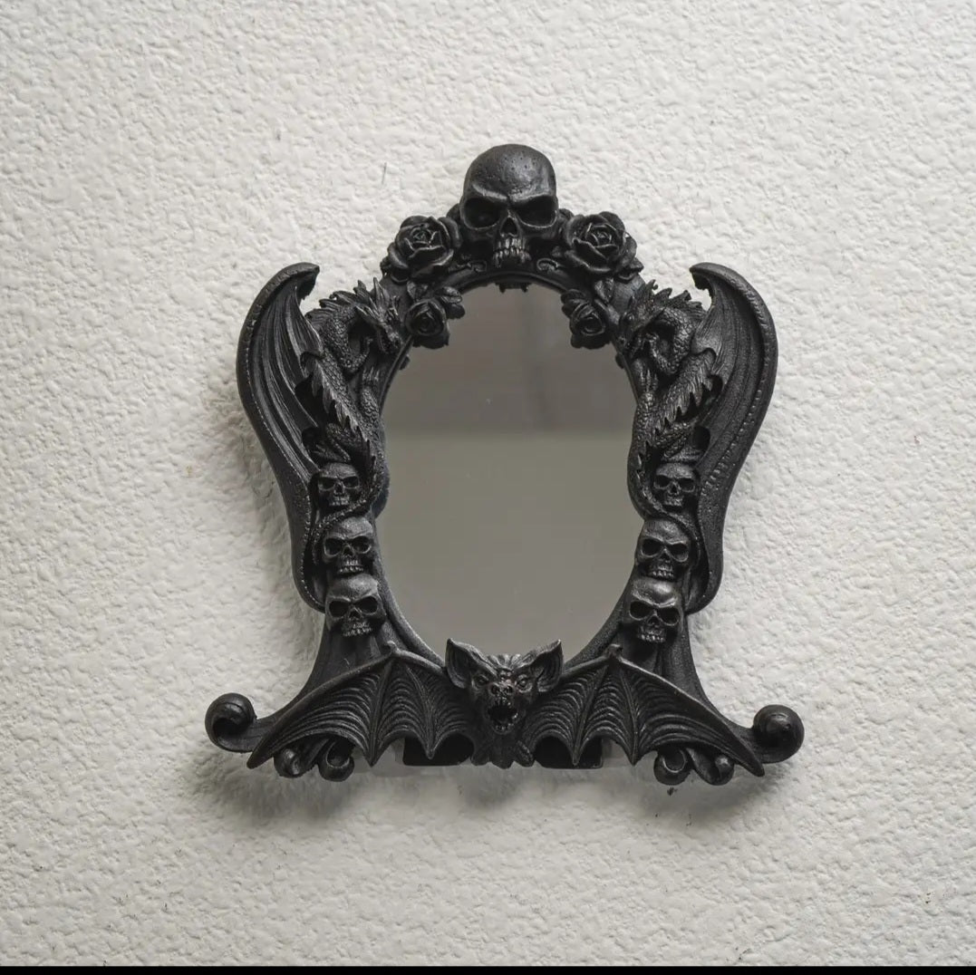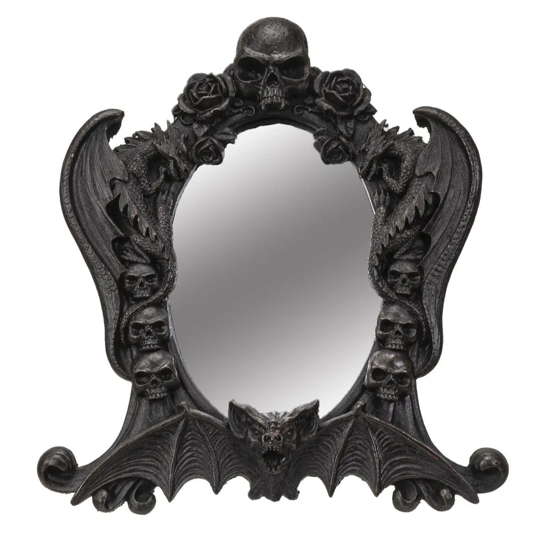 Succumb to the darkness and give in to the face of evil itself with this Nosferatu inspired mirror. Sculpted out of cold cast resin, this gorgeous mirror adds a gothic vampiric charm to any room. Reflection not included for vampiric customers.