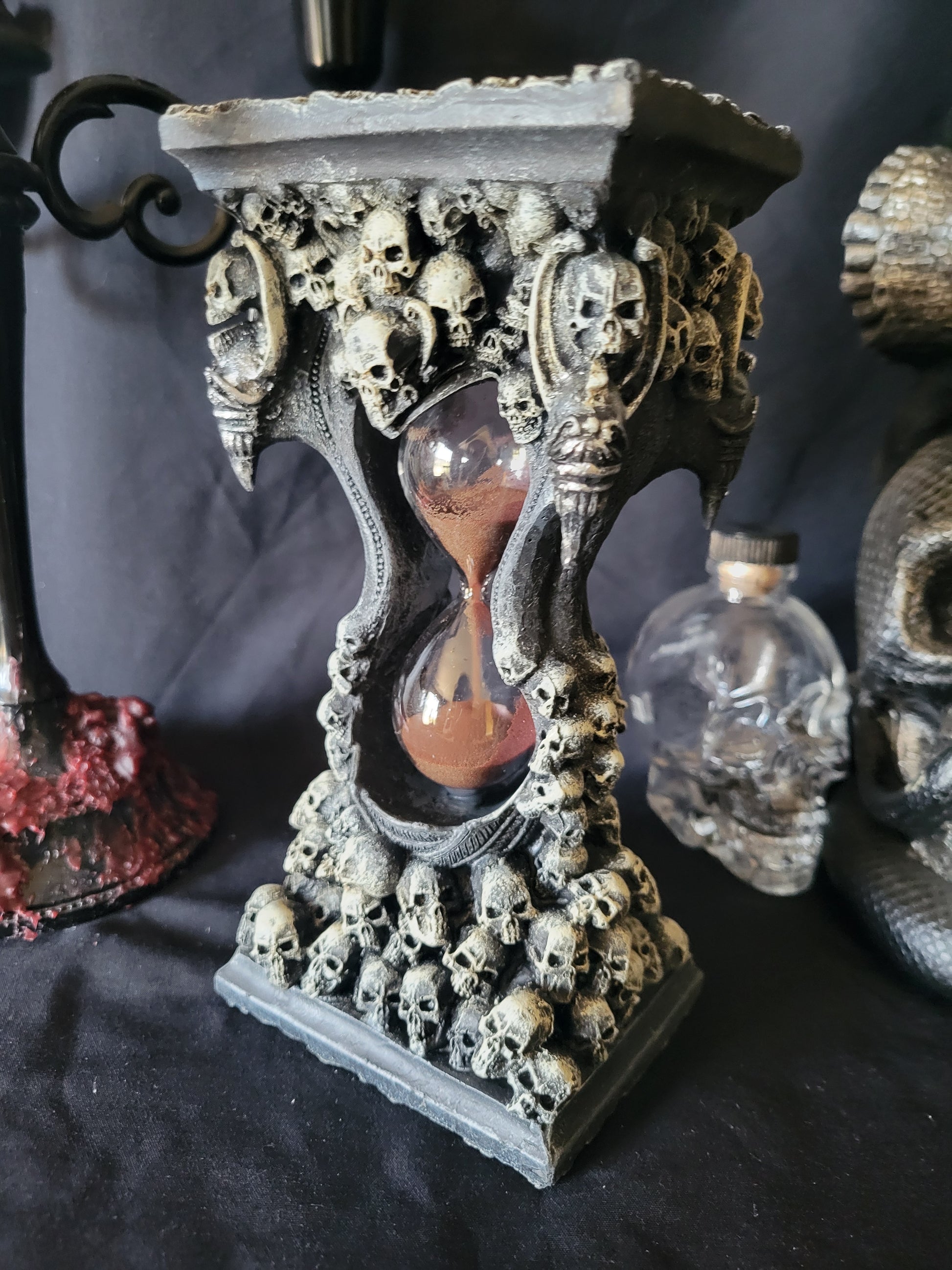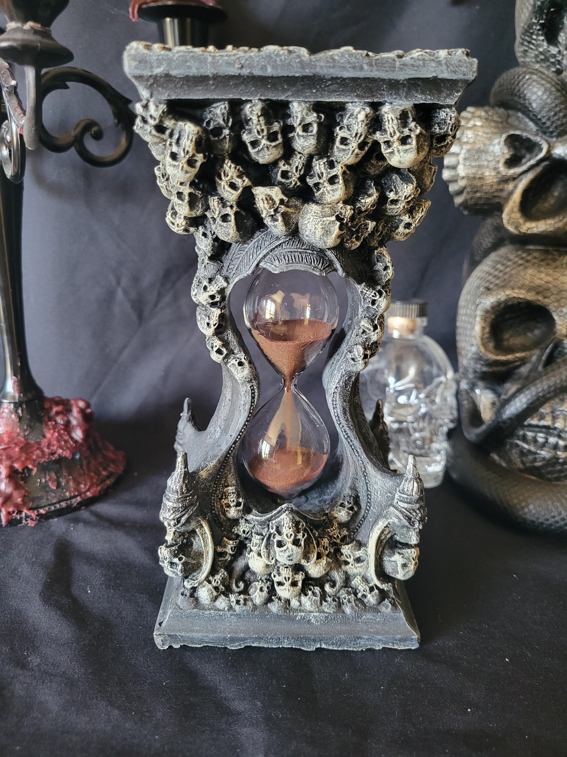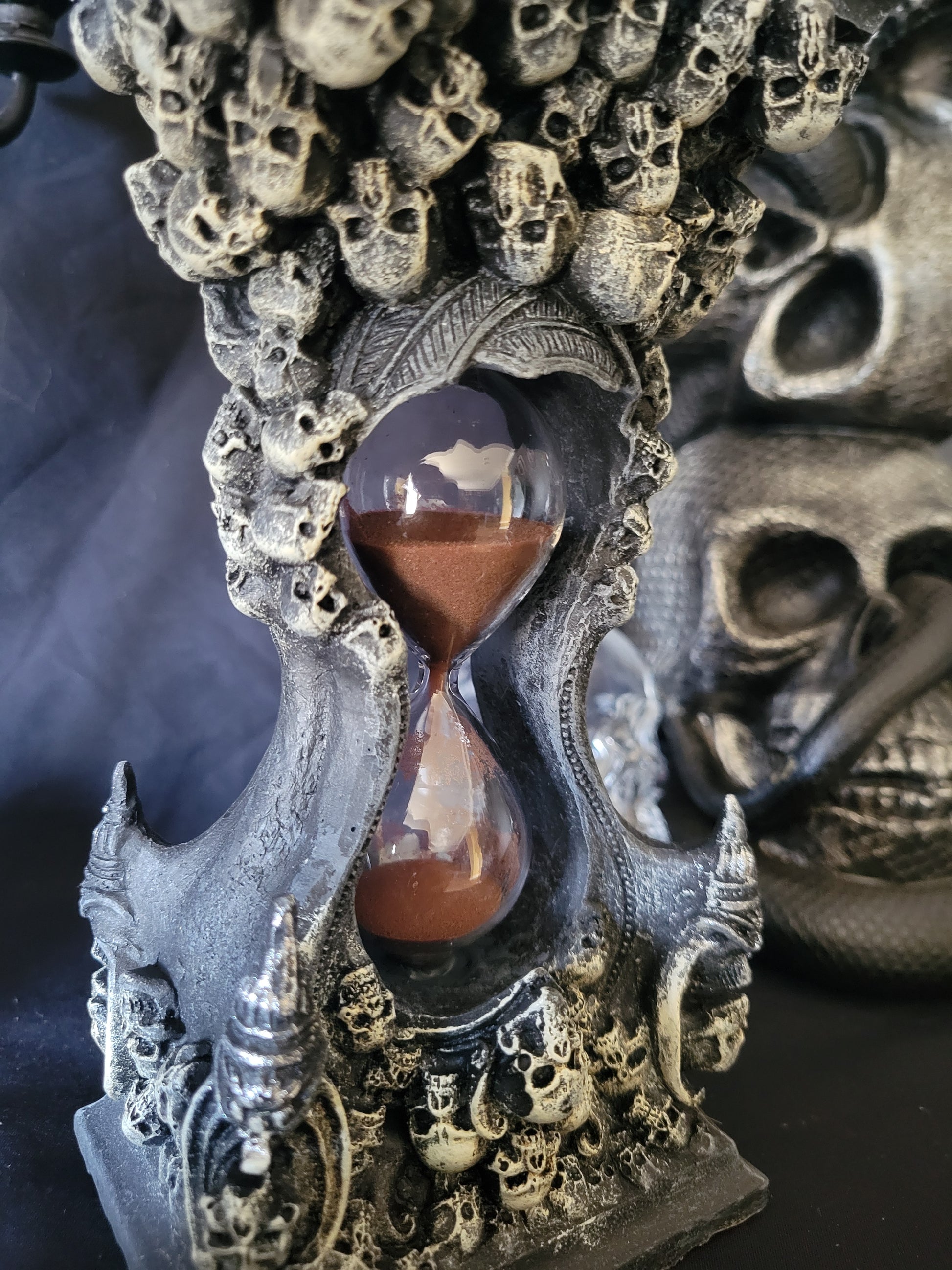 This gothic-style hourglass is a striking blend of art and functionality. Standing at 7.5 inches tall and Crafted from resin and glass, it’s adorned with small skulls and filled with dark red sand which adds a dramatic touch. This hourglass is not just a timer, but a captivating piece of decor that commands attention. Licensed by Spiral Direct Ltdc