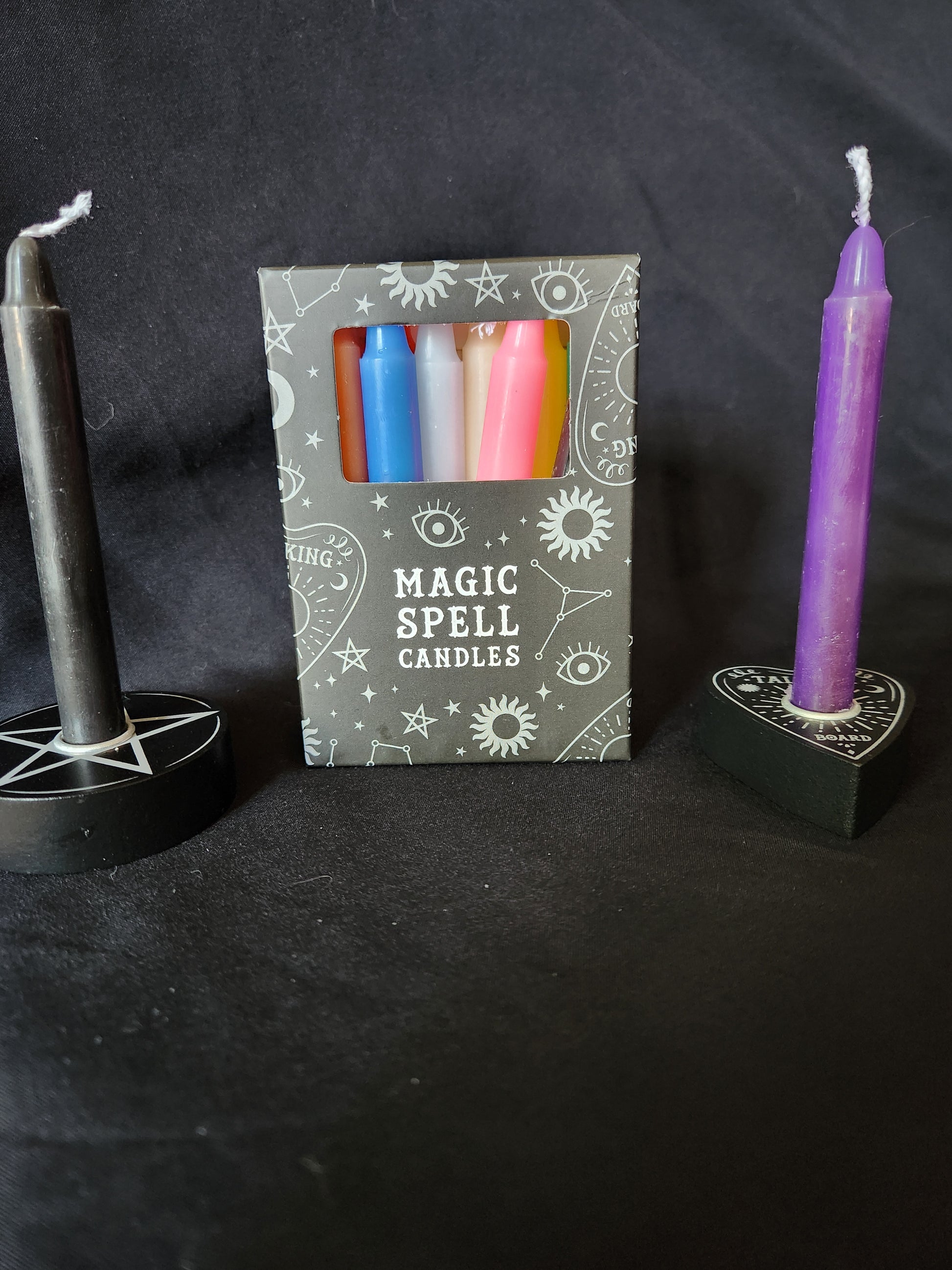 Reach beyond the veil, and get started with some basic spellcasting with this Summoning Magic Candle Kit. The kit includes 1 pack of assorted colour magic candles, 1 planchette shaped single candle holder, and 1 pentagram shaped single candle holder.